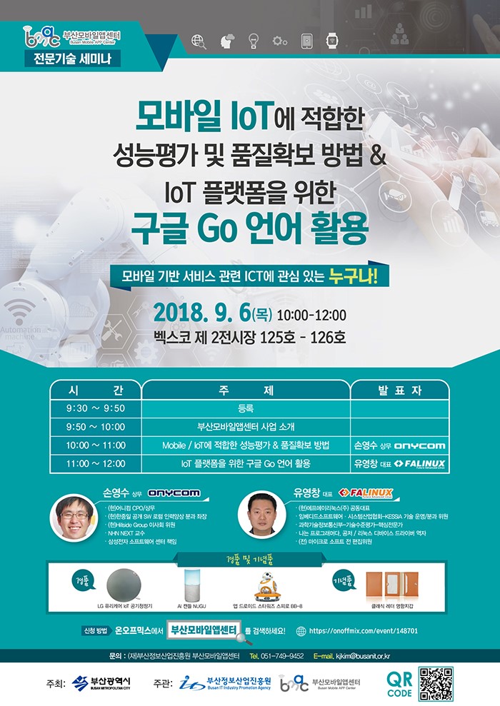 안녕하세요.^^ 부산모바일앱센터 입니다. 오는 9월6일(목) 10시 부산 벡스코에서 "모바일 IoT에 적합한 성능 측정 방법론 및 메모리 관리 기법과 IoT 플랫폼을 위한 구글 Go언어 활용"을 주제로 부산모바일앱센터 전문기술 세미나를 개최하오니 여러분들의 많은 참여와 관심 부탁드립니다.!!^^ #참가방법은 #온오프믹스에서 부산모바일앱센터 검색!!