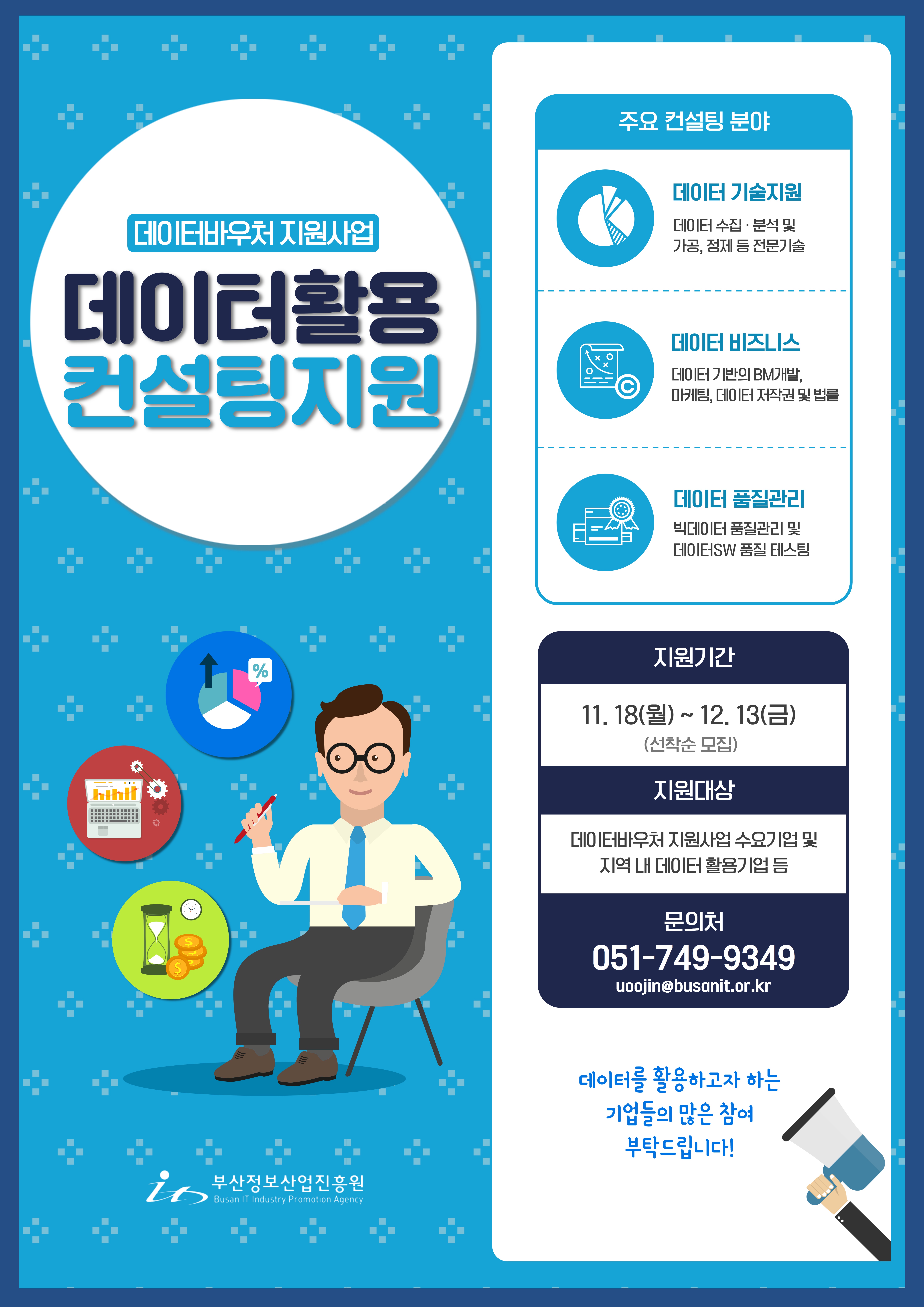 데이터를 활용하고자 하는 기업의 데이터 기술 및 비즈니스 경쟁력 강화와 데이터 경제 활성화를 위한 데이터활용 컨설팅 지원사업을 진행합니다. 빅데이터를 활용하고자 하는 기업의 많은 참여 바랍니다.