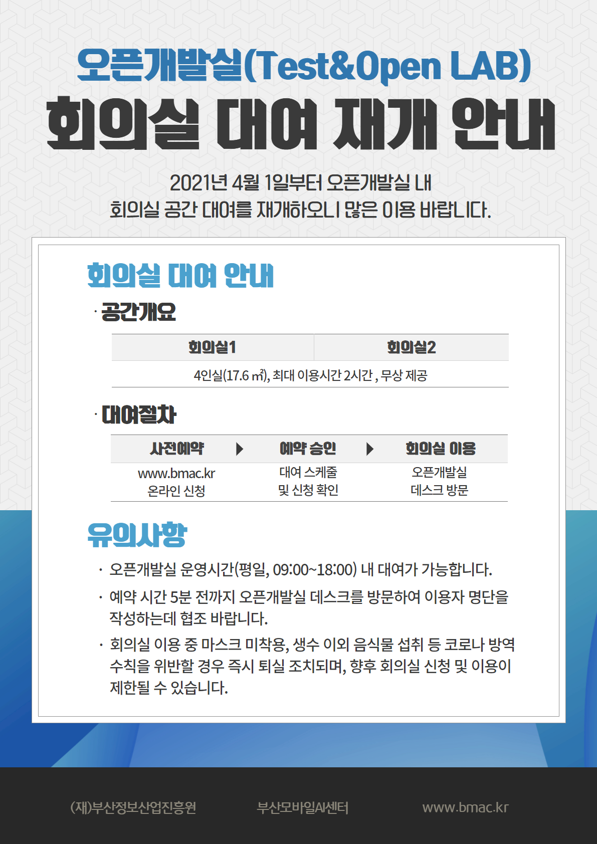 오픈개발실(Test&Open LAB) 회의실 대여 재개 안내('21.04.01~)