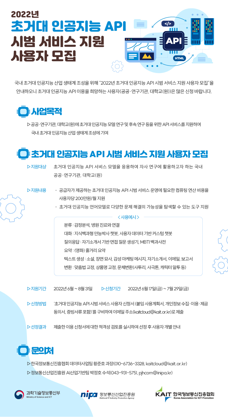 2022년도 과학기술정보통신부「초거대 인공지능 API 시범 서비스 지원」사용자 모집 공고. |