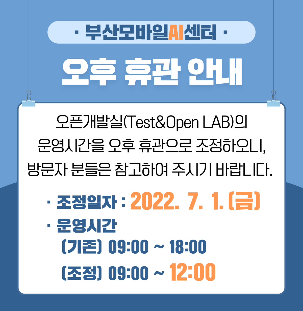 2022년 7월 1일 금요일은 오후 휴관으로 인하여 테스트베드 대여 업무가 중단됩니다.