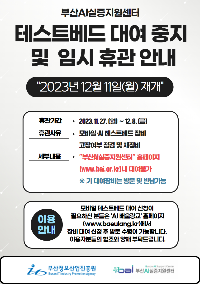 부산AI실증지원센터 테스트베드 대여 중지 및 임시 휴관 안내(2023.12.11.(월) 재개)