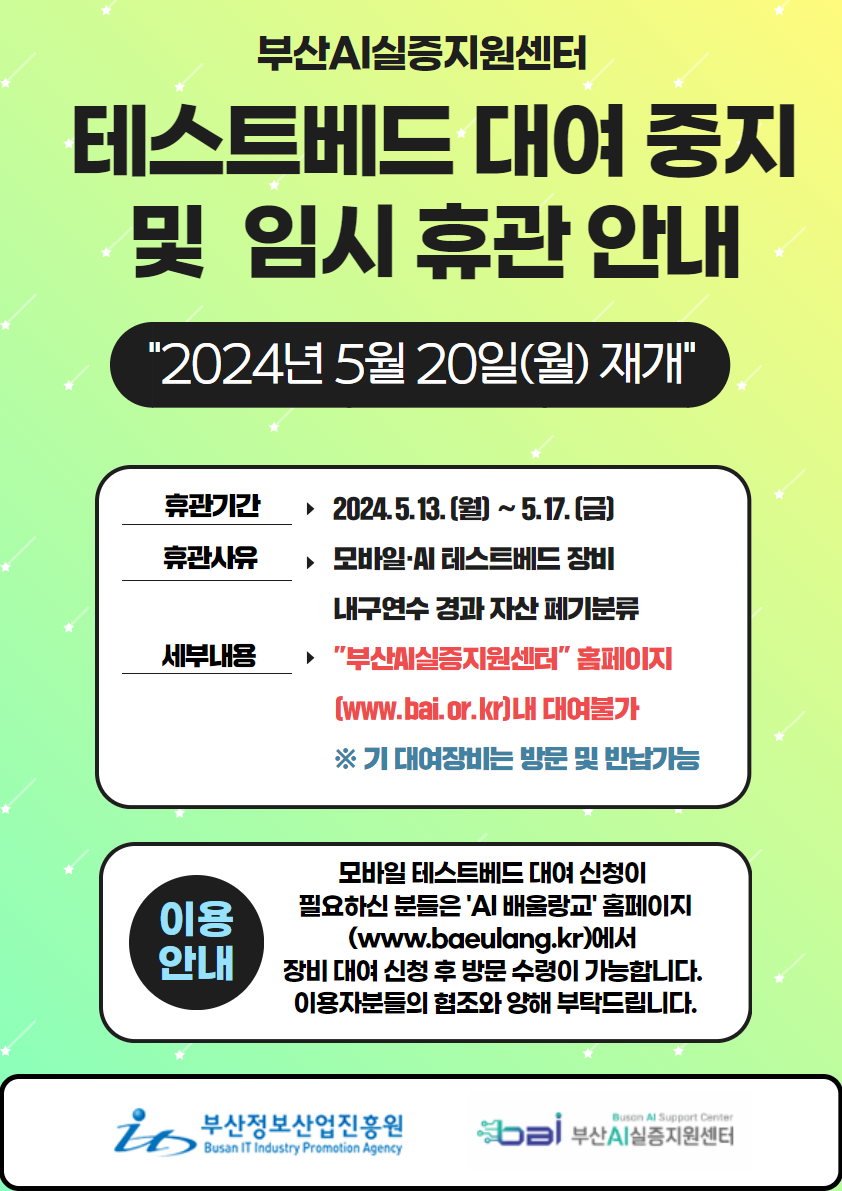 부산AI실증지원센터 테스트베드 대여 중지 및 임시 휴관 안내(2024.5.20.(월) 재개)