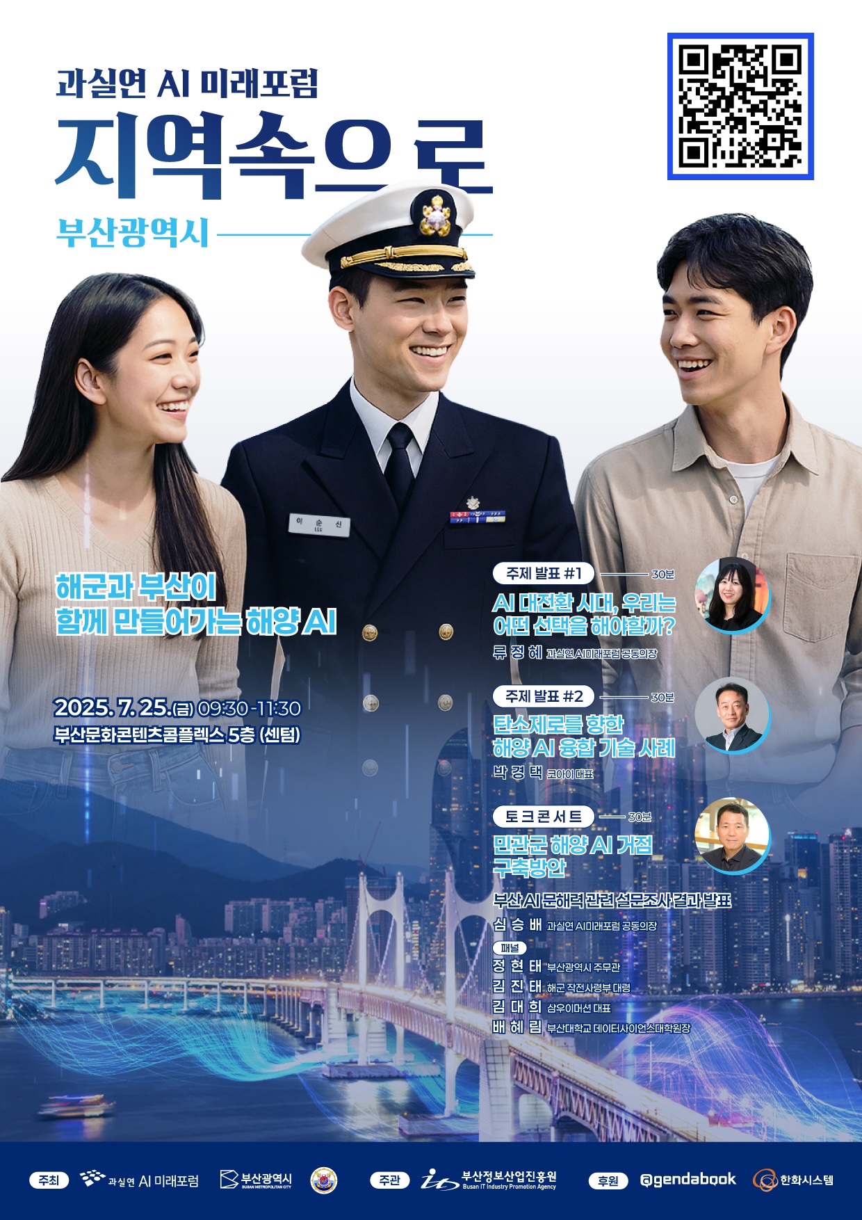 2025 과실연 AI 미래포럼 「해군과 부산이 함께 만들어가는 해양 AI」를 아래와 같이 개최합니다. 지역 AI 기술 및 산업 생태계 활성를 위한 자리로 2024년 1차 지역속으로의 도시 부산으로 1주년 기념으로 찾아갑니다. 부산에서 전국을 돌아 다시 부산으로! AI 및 해양 AI에 관심있으신 많은 분들(장병 등 포함)의 참석을 부탁드립니다. ※ 참가 신청방법: 구글폼(https://forms.gle/3NV7H7oa9hFU5nfK6) 또는 포스터 QR Code를 스캔
